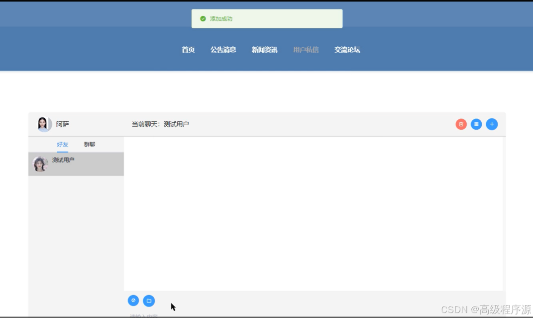 用户私信:用户可以添加论坛账户用户进行私信聊天。如图4-10所示。