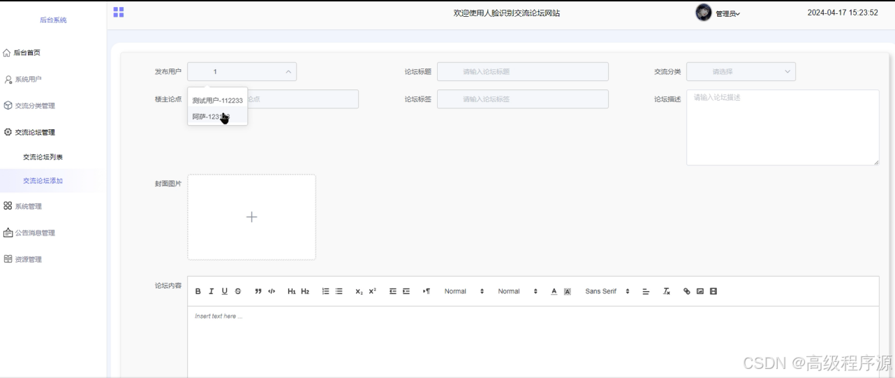 交流论坛管理:管理员可以查看交流论坛列表,包括添加、修改、删除论坛信息,包括论坛标题、交流分类、论坛标签、论坛描述、论坛内容、封面图片等。如图4-11所示。