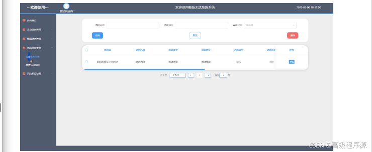 管理员可管理所有酒店信息的发布、下架、更新等操作,提供搜索功能,支持查看和管控其评论内容,负责审核酒店信息。资源管理界面如下图所示。