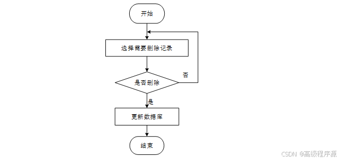 用户选择需要删除的记录后,系统判断是否确认删除。若未确认,返回选择环节;若确认删除,则更新数据库,删除对应记录,完成操作后流程结束。删除信息流程图如下图所示。