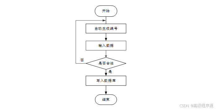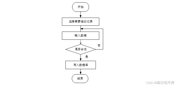 用户首先选择需要修改的记录,输入修改后的数据,系统判断输入数据是否合法。若数据不合法,提示重新输入;若数据合法,则将修改后的数据写入数据库,完成操作后流程结束。修改信息流程图如下图所示。