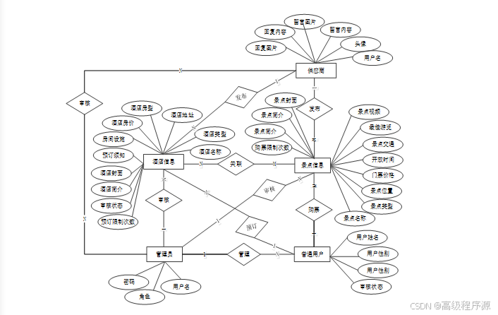 概念设计是数据库设计的第一步,其主要目标是对系统的数据需求进行全面的理解和抽象。在进行数据库设计时,概念设计可以帮助明确系统的整体结构和需求[9]。在这一阶段,需要确定实体、属性以及它们之间的关系,为后续的数据库表设计奠定基础。接下来,将深入探讨数据库表设计的具体细节,实现更高效的数据存储和管理。本“畅旅无忧”旅游系统全局E-R图如图4.7所示。