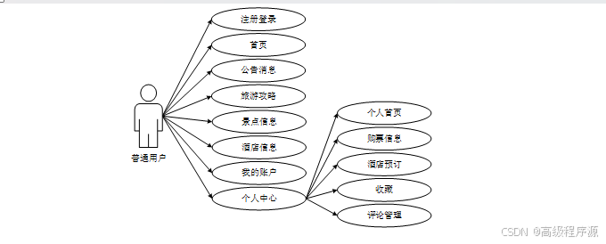 本“畅旅无忧”旅游系统的普通用户角色模块主要包含注册登录、首页、公告消息、旅游攻略、景点信息、酒店信息、我的账户、个人中心等功能。普通用户角色用例图如下图3.1 所示。