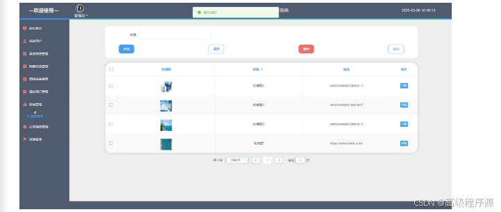 系统管理:管理员可管理系统的轮播图信息,包括新增、编辑、删除轮播图,提供搜索功能,支持图片附带链接。