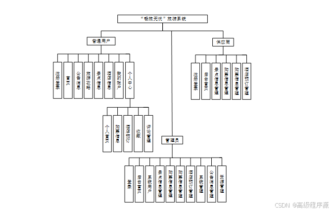 根据需求分析的结果,可以将“畅旅无忧”旅游系统的功能划分为不同的模块。该系统主要可以划分为普通用户、供应商和管理员三大模块,每个模块负责实现特定的功能,又可细分不同子模块,并与其他模块进行协作。本“畅旅无忧”旅游系统的功能结构图如图4.6所示。
