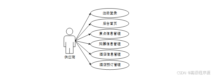 本“畅旅无忧”旅游系统的供应商角色模块含有注册登录、后台首页、景点信息管理、购票信息管理、酒店信息管理、酒店预订管理等功能。供应商角色用例图如下图3.2 所示。