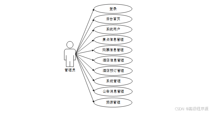 本“畅旅无忧”旅游系统的管理员角色模块则涵盖了注册登录、后台首页、景点信息管理、购票信息管理、酒店信息管理、酒店预订管理等功能。管理员角色用例图如下图3.3 所示。