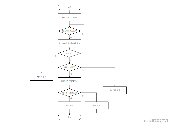 用户输入用户名和密码后,系统先检查输入是否为空,再验证用户名是否存在,若存在则通过用户名获取密码并校验。若密码正确则登录成功,否则提示密码错误。若用户名不存在或无法登录,提示用户操作无效。登录流程如下图所示。