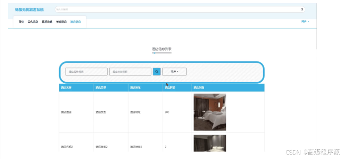 酒店信息模块主要为用户提供酒店信息展示,支持关键字、排序搜索,普通用户可以浏览酒店信息,并点赞、收藏和评论酒店信息,详情页提供预订功能。界面如下图所示。