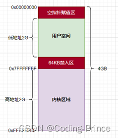 虽然一个进程分配的4GB的内存地址, 但是其实真正能用的空间只有低地址的2GB空间, 在低地址的2GB空间中有2个占64KB的空间无法使用, 分别是空指针赋值区和64KB禁入区。