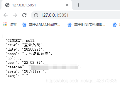 return jsonify({"station": data[0], "no": data[1], "name": data[2], "date": data[3], "zwrq": data[4], "qssj": data[5],"zzsj": data[6], "cznr": data[7], "CZNRKZ": data[8]})
