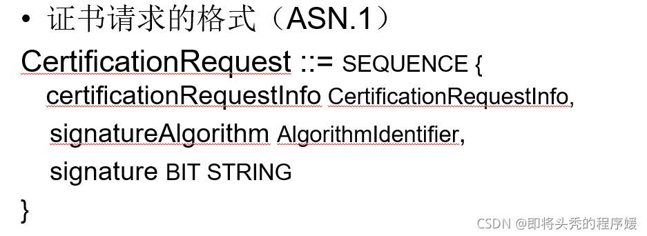 证书请求语法标准。PKCS#10定义了证书请求的语法。证书请求包含了一个唯一识别名、公钥和可选的一组属性,它们一起被请求证书的实体签名(证书管理协议中的PKIX证书请求消息就是一个PKCS#10)。