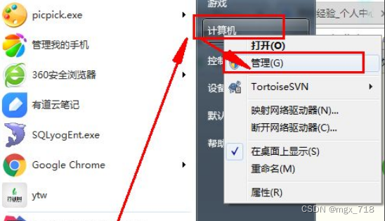 1、点击左下角开始按钮,计算机上右键,点击【管理】。