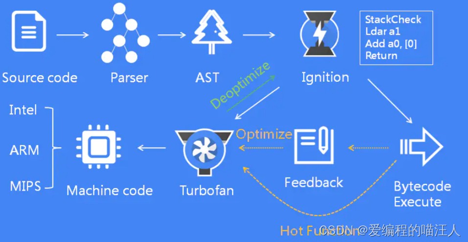 AST转换成字节码并执行,同时会标记热点代码; - TurboFan: 编译器,负责将热点代码编译成机器码并执行;