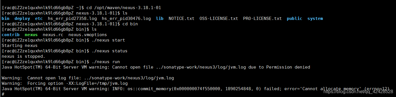 如下图所示,bin在nexus-3.18.1,permission denided 中说明sonatyp-work没有权限,切换到root用户加上权限