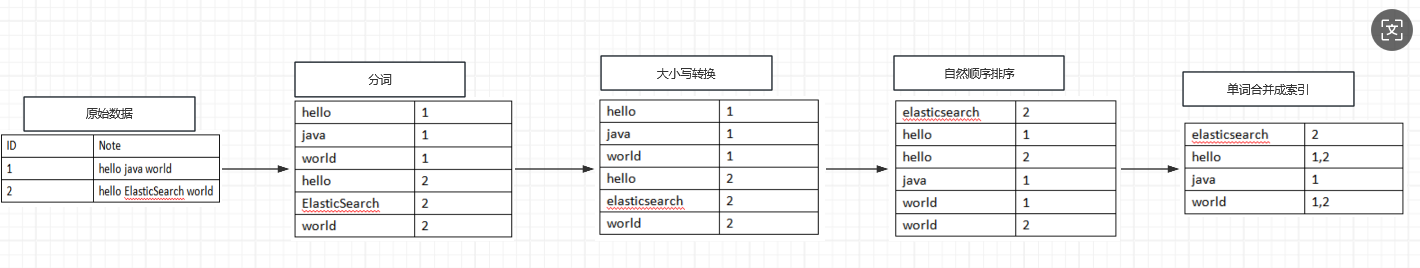 原始数据经过:分词,词大小写转换,自然排序,单词合并形成倒排索引。