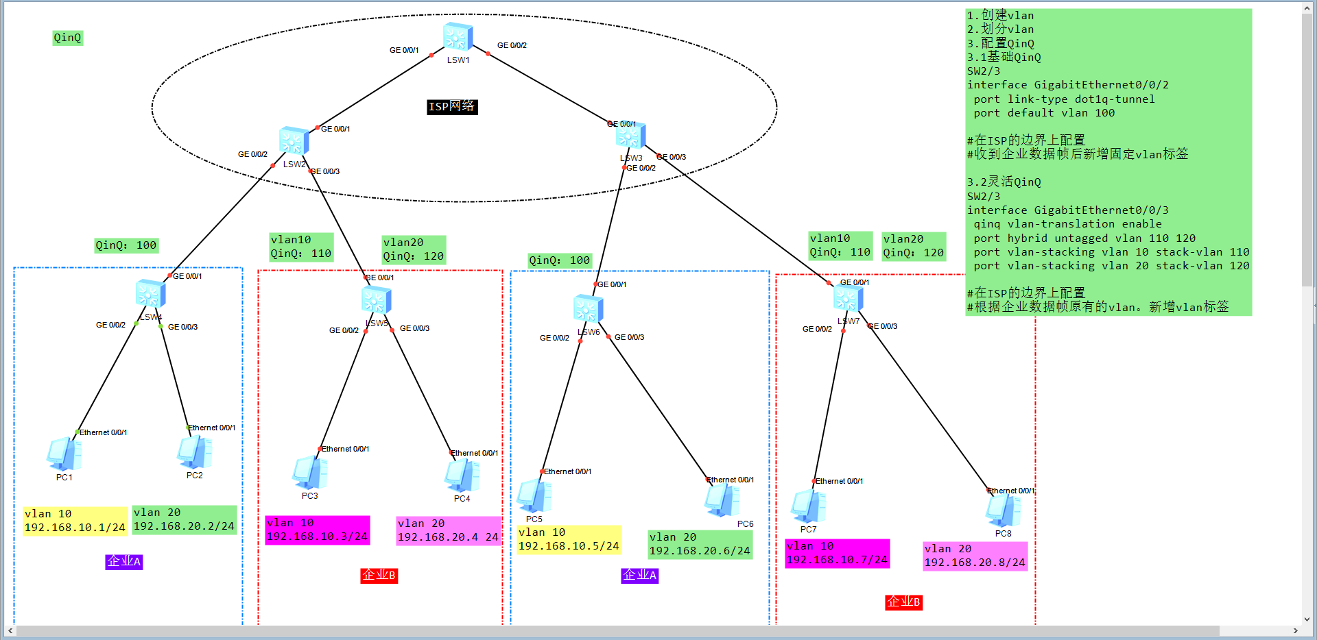 ISP网络内部只需要创建vlan100,且放行100即可。企业A网络内部只需要创建vlan10 20,且上联放行10 20即可,其他划分vlan和放行vlan正常配置即可
