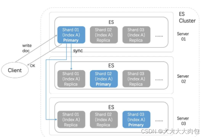 一个Index含有多个分片(shard),其中有一个 primary 主分片,负责写入,其他副本为 replica,不能写,只能同步 primary 的数据,但可以处理读请求。