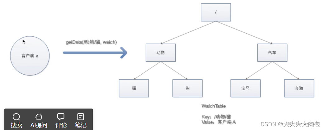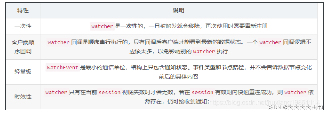 我们可以把Watch理解成是注册在特定Znode上的触发器。当这个Znode发生改变,也就是调用了create,delete,setData方法的时候,将会触发Znode上注册的对应事件,请求Watch的客户端会收到异步通知