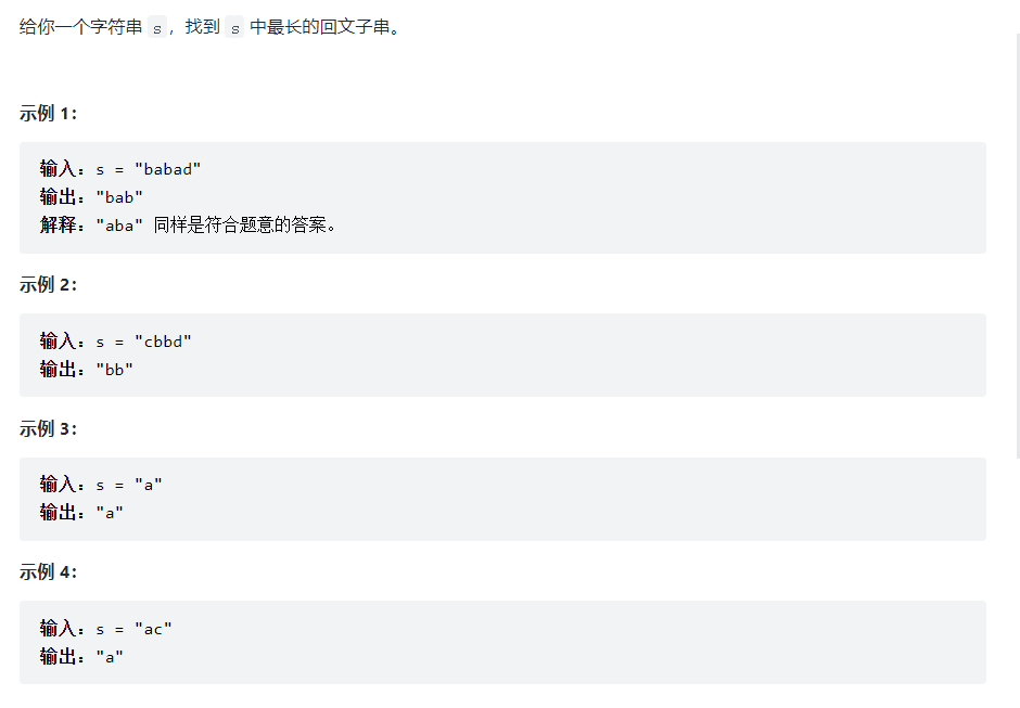 好久么刷题,现在回来继续做,哼哧哼哧哼哧哼哧。 题目如上,求一个最长回文数。之前的idea都是将所要求的字符串倒序,然后找这两个字符串的最长公共子序列,复杂度很明显,O(N2)。遂改之,问舍友,舍友答,用中心扩散法不香乎,翻阅解法,苦读之,直呼真香。 解法思想为取一点,两个边界点,left,right。先将left往左偏移,只要与取得点相同,再向左,不同立停。右侧同。这一步解决了考虑奇偶性问题,因为只要是重复字符,都是回文子字符串,你品,你细品。然后再来判断左边界与右边界是...