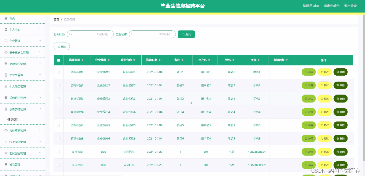 信息咨询管理 ,在信息咨询管理页面可以查看咨询标题、企业编号、企业名称、咨询日期、备注、用户名、姓名、手机、审核回复等内容,并可根据需要对信息咨询管理进行添加,修改,删除或详细内容等操作,如图5-7所示。