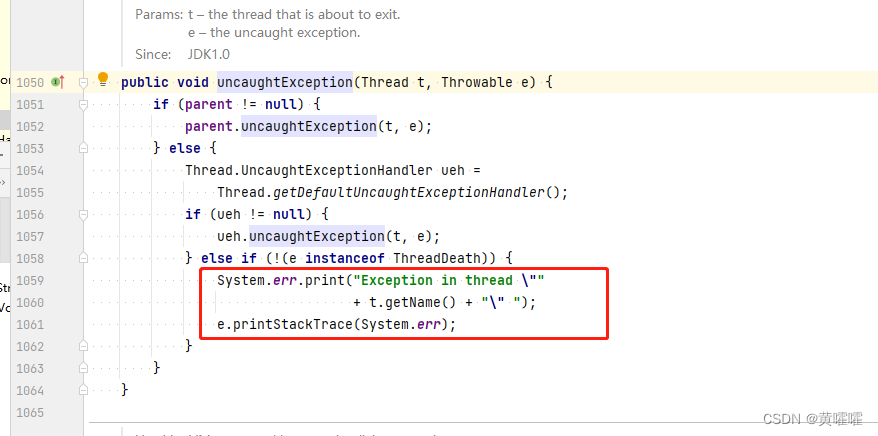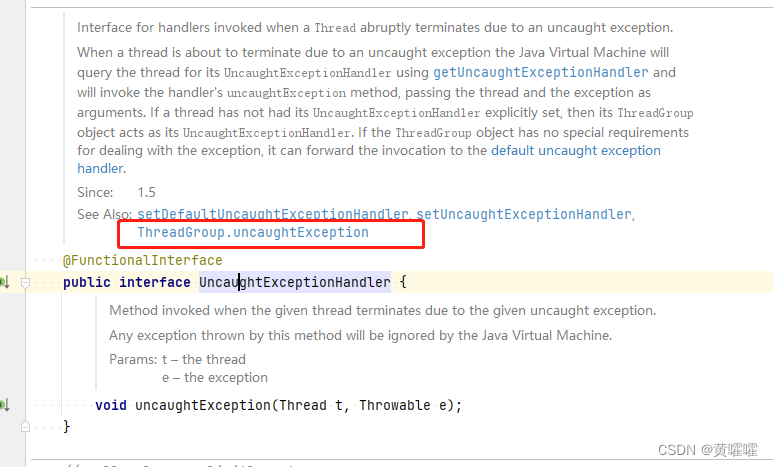 我们通过查看Thread的源码 , 可以看到如下代码 , UncaughtExceptionHandler , 当线程由于未捕获的异常而突然终止时调用的处理程序的接口。