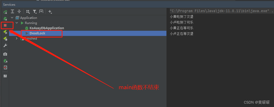 此时控制台情况如下 , 双方都在等资源, 然后双方已拿到的又都不松手 , 形成了互相等待的局面, 而main函数也因这两个线程的阻塞 无法正常退出.