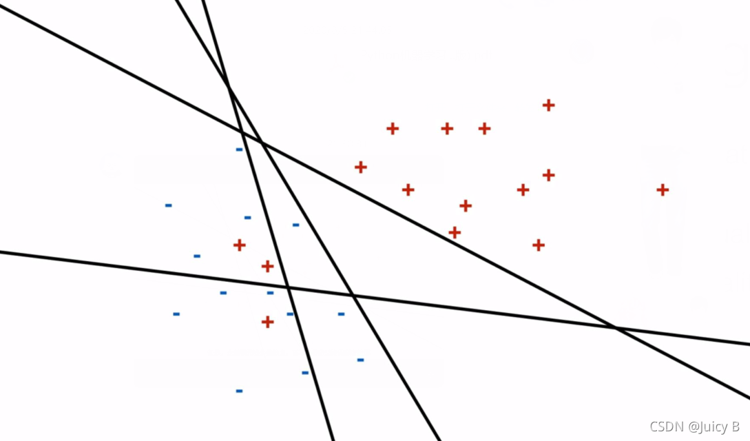 如果想要画出一条边界将红蓝两类样本分开,实际上有非常多种画法: