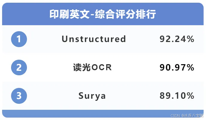 在印刷英文识别准确度测试环节,综合前三分别是Surya、Unstructured和读光OCR,还是国外开源软件领先。
