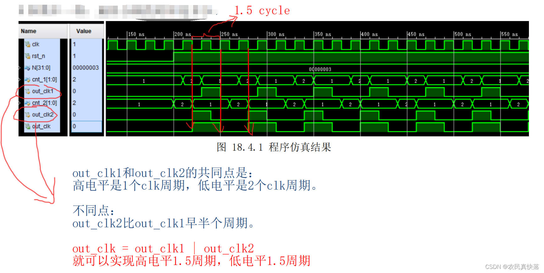 - 构造out_clk1和out_clk2信号,高电平都是1个周期,低电平都是2个周期,两个信号的区别是相差半个周期的相位。
