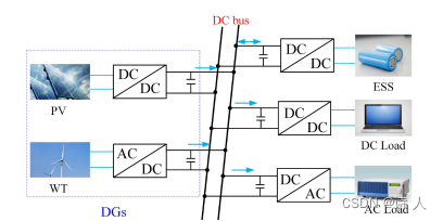 直流微电网是一个由直流电源构成的微电网,其中风、光等分布式可再生能源发电系统、储能单元、电动汽车及其他直流用电负荷是直流微电网系统的重要组成部分,各分布式单元通过dc/ac、dcdc等变流环节接入网内。