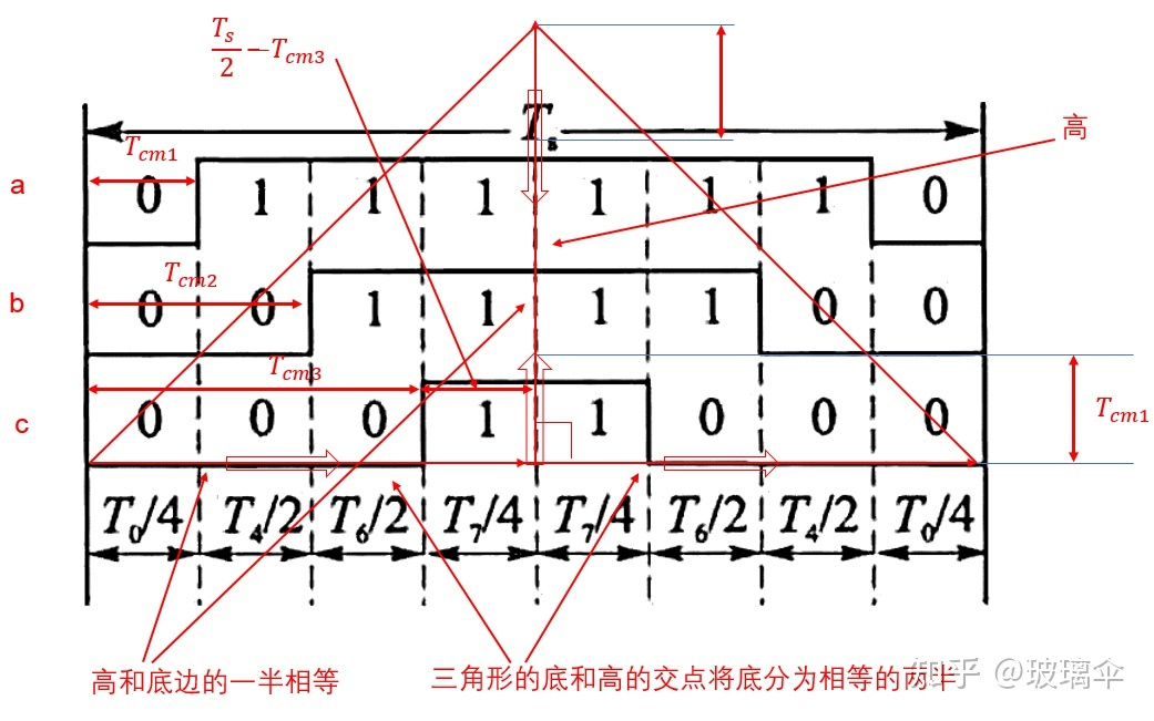 输出的电压是立刻作用到了负载上面吗?还不是的。输出的比较值和三角波进行比较,产生PWM信号,上图中的橘黄色线。对于这种7段式SVPWM来说,调制特点决定了还有0.5Ts的延时,也就是第二个绿色虚框中的分母部分。