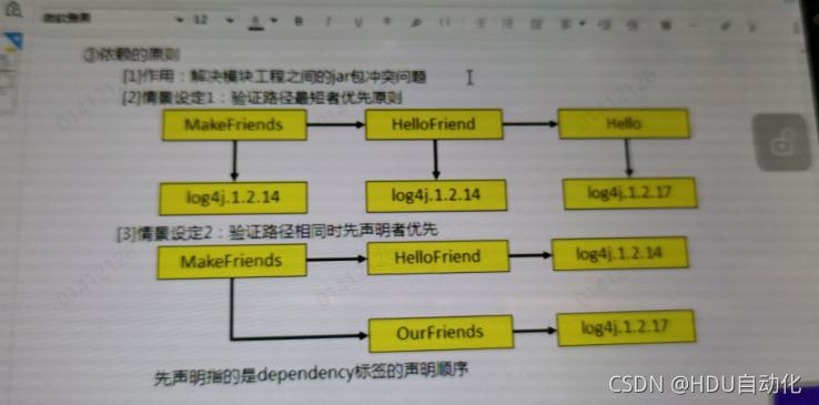 情景设定2:在依赖传递时验证路径相同先声明者优先,当HelloFriend和Hello距离MakeFriend距离一样的时候,看MakeFriend的pom文件先依赖的是Hello还是HelloFriend,先依赖的是谁就依赖谁的log4j。