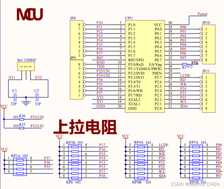 这部分原理图我们就没有什么好分析的了,当然仔细琢磨其中还是有很多耐人寻味的设计,大家感兴趣可以参考一下博文:原理图分享一(单片机_CT107D训练平台使用说明与电路原理图)_ManGo CHEN的博客-CSDN博客
