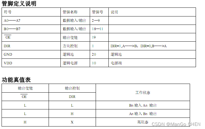 现在只需搞清楚如何使用芯片74HC245(74HC245芯片的用途_ManGo CHEN的博客-CSDN博客),下面是管脚的定义说明: