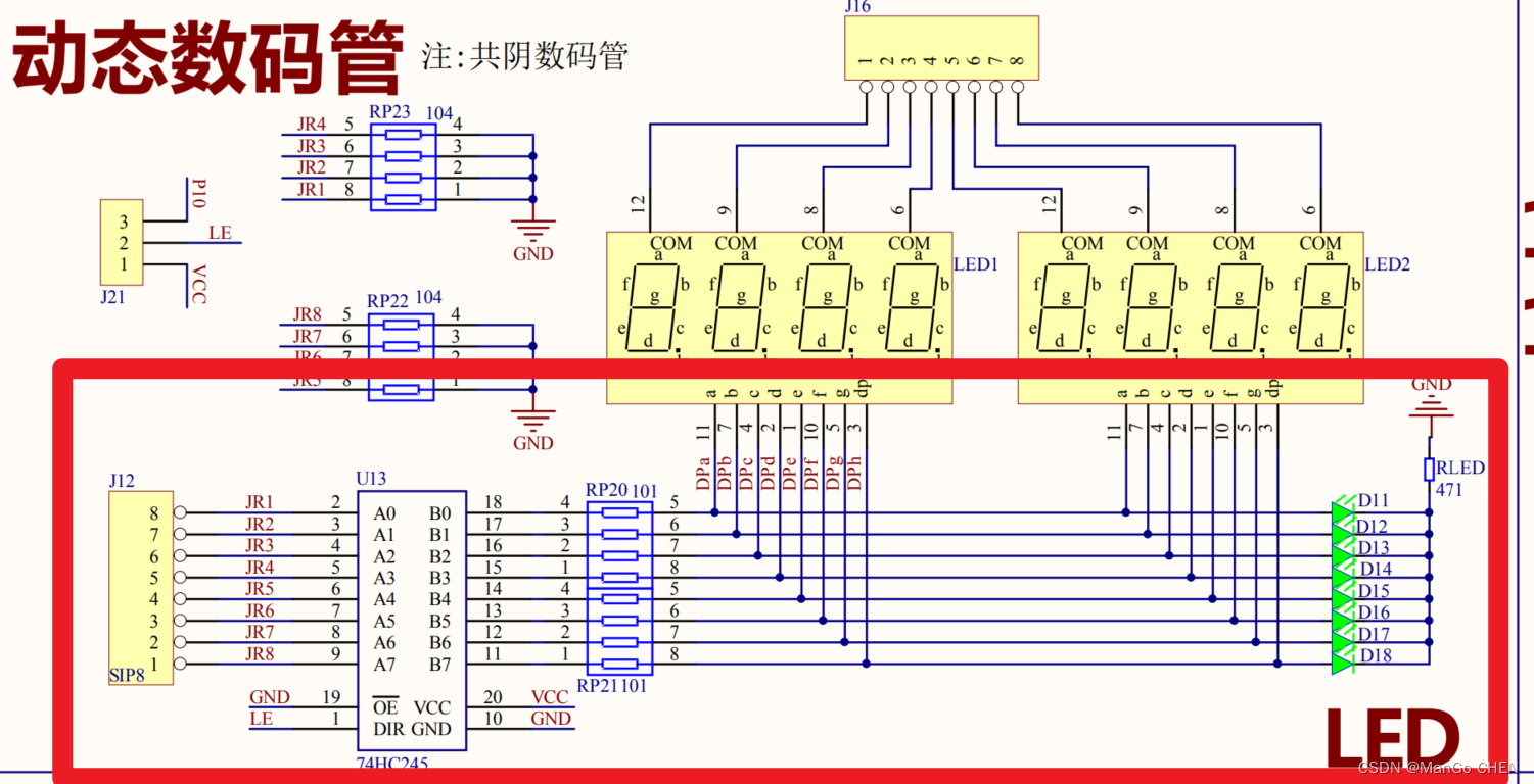 图中J12为一个8pin的排针接口,通过74HC245芯片接上一个限流电阻再接到LED(D11~D18)的阳极