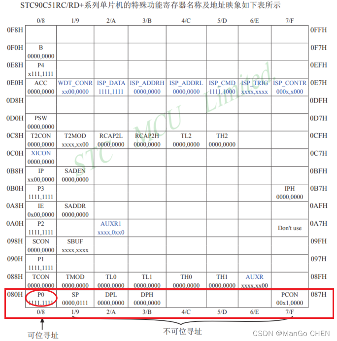 当然是看手册得来的,看什么手册呢?当然是MCU的手册喽,从手册中可以得知这些特殊功能寄存器的地址是多少: