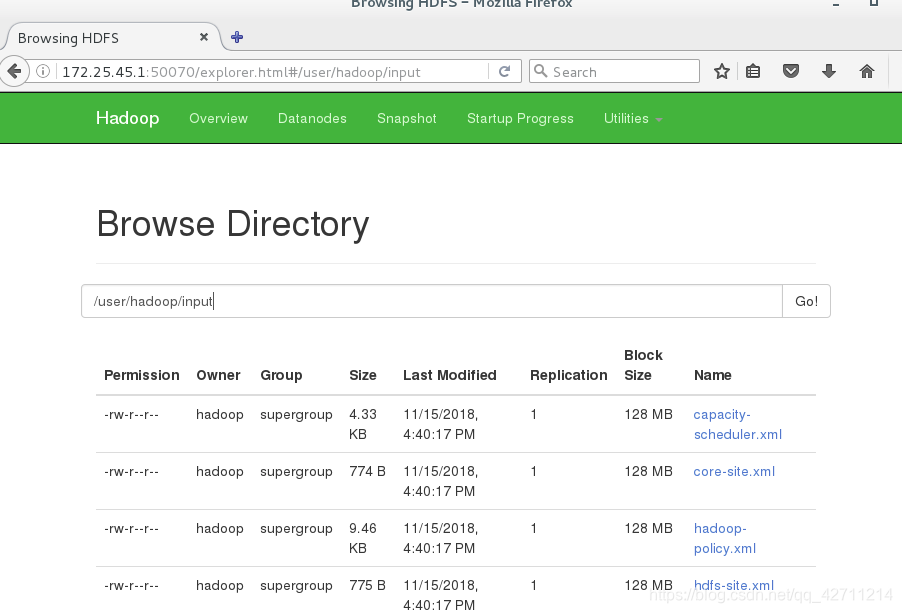 [hadoop@server1 hadoop-2.7.3]$ bin/hdfs dfs -put input/ 将input目录上传到/user/hadoop/下
