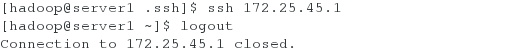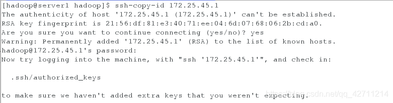 [hadoop@server1 hadoop]$ ssh-copy-id 172.25.45.1 ##把本地的ssh公钥文件安装到远程主机对应的账户