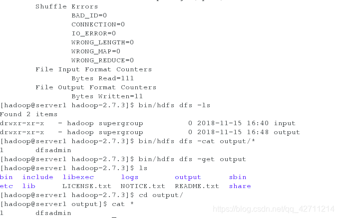 [hadoop@server1 hadoop-2.7.3]$ bin/hdfs dfs -get output