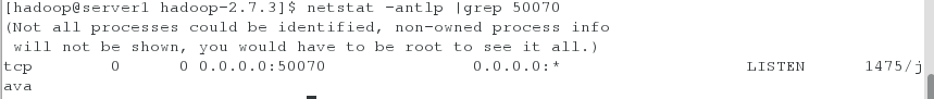 [hadoop@server1 hadoop-2.7.3]$ jps 如果jps查看不存在,只要进程或者端口开启说明服务也启动成功了