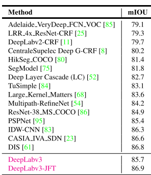 ASPP +多重网格+图像池:随着在多重网格率(R 1,R ₂,- [R ₃)=(1,2,4),使得ASPP(6,12,18)中的模型在77.21米欧表现最佳。在具有多尺度输入的COCO数据集上的output_stride = 8时,该模型在82.70进行了测试,通过将output_stride从16更改为8,可以显示出进一步的改进。