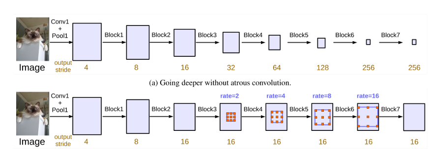图3.顶部(a)是规则的CNN,第二个(a)是级联的r> 1的atrous卷积,output_stride为16