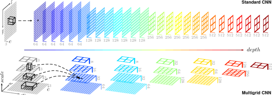 第二种是多网格方法,即不同大小的网格的层次结构(请参见图4)。他们定义了一个multi_grid参数作为一组空率(r1,r2,r1),它们按顺序应用于三个块。最终原子速率等于单位速率和相应速率的乘积。因此,例如,在output_stride为16且multi_grid为(1,2,4)的情况下,块4(如图3所示)将具有三个卷积,比率为2*((1, 2, 4)=(2, 4,8),