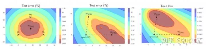 左图:W1、W2、W3分别代表3个独立训练的网络,Wswa为其平均值。中图:WSWA 在测试集上的表现超越了SGD。右图:WSWA 在训练时的损失比SGD要高。