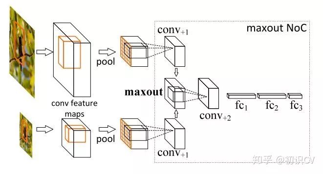 在[2]中,选择单一尺度的方式被Maxout(element-wise max,逐元素取最大)取代:随机选两个相邻尺度,经过Pooling后使用Maxout进行合并,如下图所示。