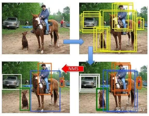 NMS(Non-Maximum Suppression,非极大抑制)是检测模型的标准后处理操作,用于去除重合度(IoU)较高的预测框,只保留预测分数最高的预测框作为检测输出。Soft NMS由[6]提出。