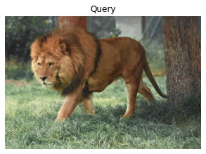 在我们从所有图像中提取特征之后,现在我们可以尝试使用查询检索类似的图像。在这种情况下,我们可以输入一张看起来类似下图的狮子: