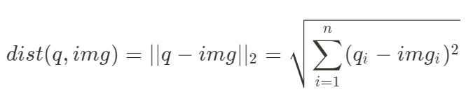 提取特征后,计算查询与所有图像之间的距离。为了做到这一点,我们可以使用欧几里得度量或 l 2标准来衡量它。如果数字越来越小,那么这一对图像就是相似的。公式是这样的: