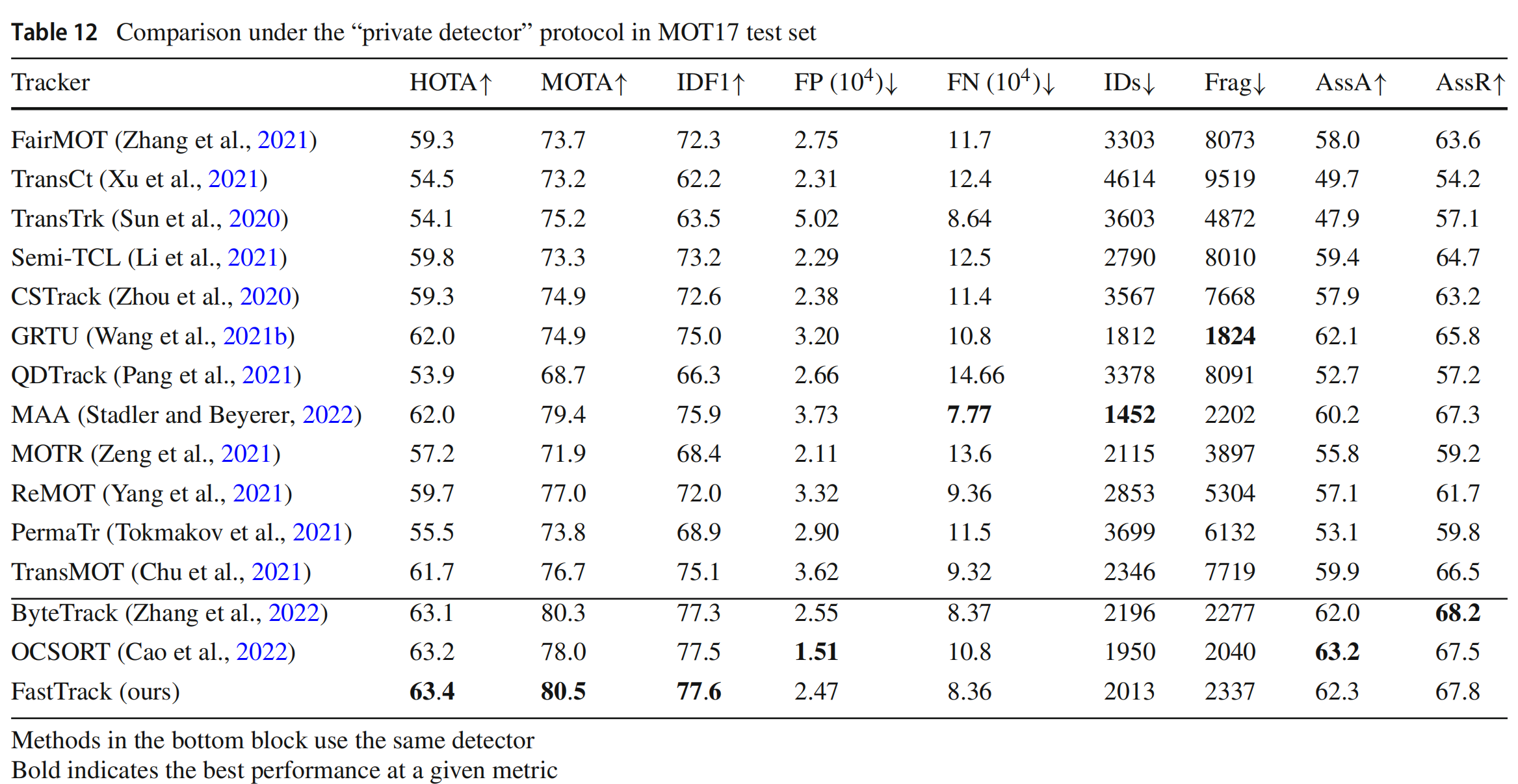 我们在表12和表13中报告了Fast在MOT17和MOT20测试集上的性能,使用与ByteTrack和OCSORT相同的检测器YOLOX。遵循MOT17-val的设置,ξ默认为0.05,ω在MOT17和MOT20中均为0.85。在MOT17和MOT20上都使用了HIoU,并且λ设置为0.8。尽管接收到相同的检测结果,OCSORT首先丢弃了低分检测结果然后再开始跟踪,遵循SORT的做法,而Fast则利用分数优先级自动确定我们提出的代价矩阵中的关联优先级,这允许Fast跟踪更多低分对象,因此在MOTA上比OCSORT高出2.5%和1.8%。同时,Fast也在MOT17上达到了最高的HOTA和IDF1,在MOT20上则具有竞争性的HOTA。值得注意的是,在MOT20上,Fast通过其革命性的GPU范式获得了显著的效率提升,即比OCSORT快7倍。
